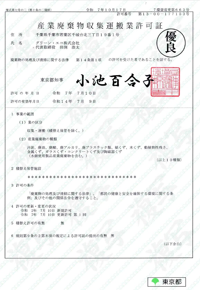 産業廃棄物収集運搬業許可証を、拠点の千葉だけでなく茨城県、埼玉県、神奈川県、東京都、栃木県でも取得し、幅広いエリアに対応しています。電子マニフェスト導入による適切な処理の推進で、コンプライアンスの遵守に努めています。
